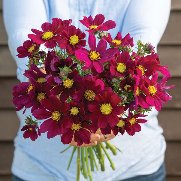 Stora blommor i mörkt vinrött/magenta med gul mitt. Denna sort har raka, stadiga stjälkar och är framtagen för att passa för snitt.