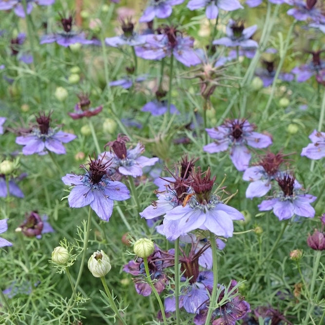 Sammetsliknande blommor som skiftar i midnattsblått till ljusblått med svart ståndare som bildar dekorativa mörklila fröställningar. Både blommorna och frökapslarna går bra att torka. Självsår sig villigt.